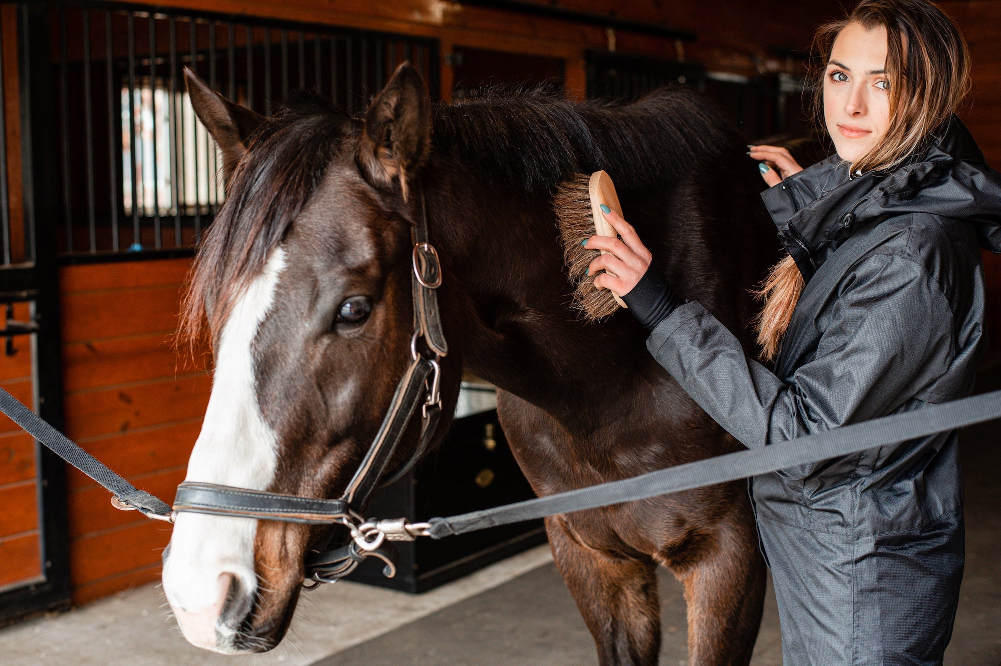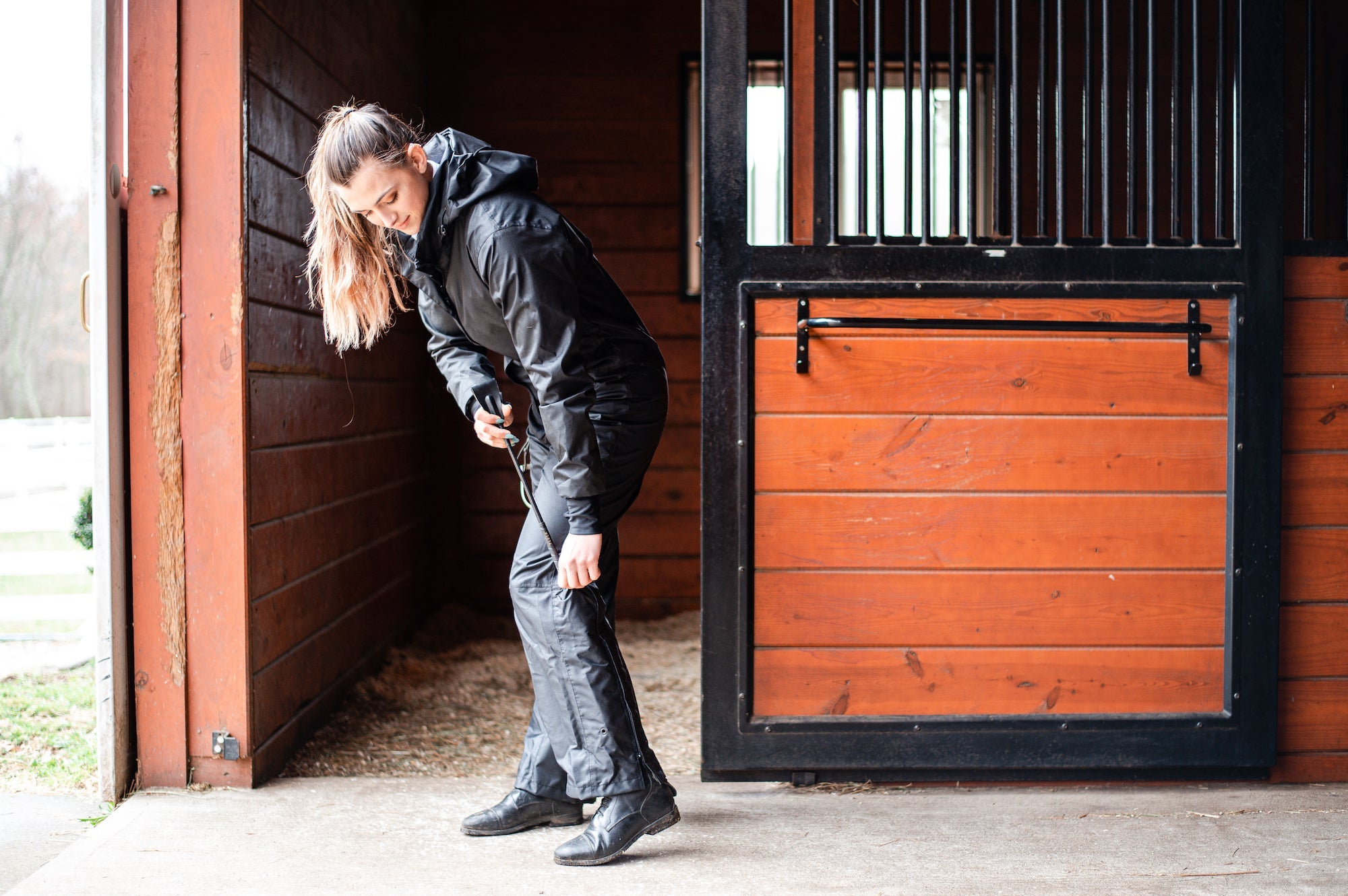 The Waterproof Rain Gear delivers the same rider-focused design as our signature jumpsuit, without the insulation, for year-round protection from wet weather. Its breathable, fully waterproof shell with taped seams keeps you dry from barn chores to saddle time, while features like a helmet-friendly hood, easy-on leg zips, and plenty of pockets make it as practical as it is comfortable. Stay comfortable, whatever the forecast.